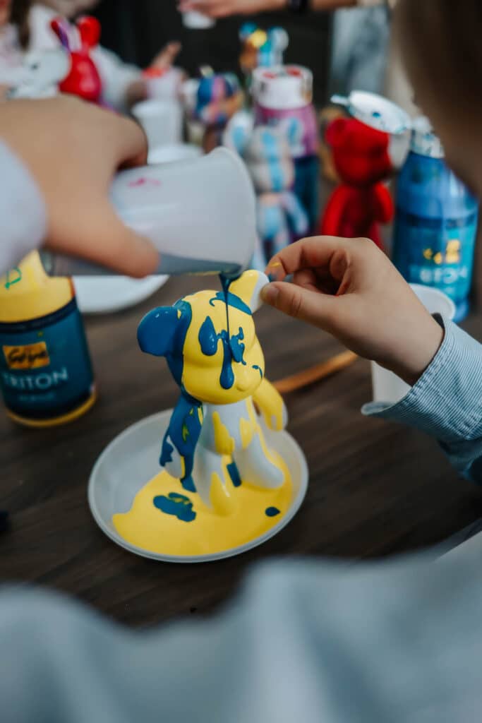 Järgmisena ootas meid Flash Arti stuudio, kus said käed värviseks ja loovus valla. Akrüülvärvidega said uue ilme karud ja jänes – iga loom täpselt oma peremehe nägu, olgu see rahvuslikes sinimustvalgetes toonides või süngemates must-punastes varjundites.